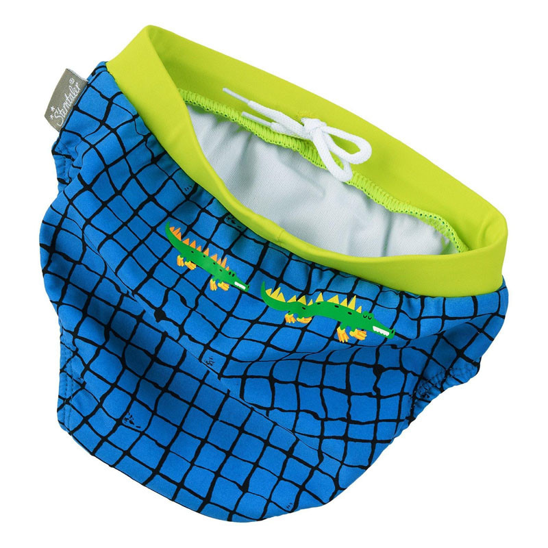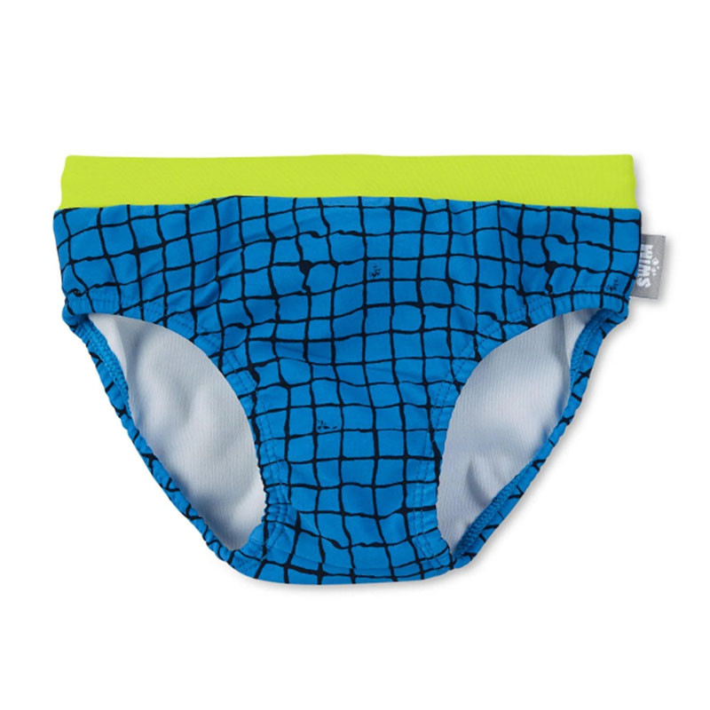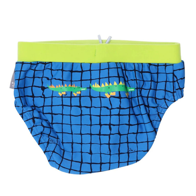 Modré kárované plavky so svetlozelenými manžetami z príjemnej plavkovej látky sú ideálne na plávanie a špliechanie. Slipové plavky sú v zadnej časti zdobené motívom krokodíla. Šírka sa dá nastaviť pomocou šnúrky na vnútornej strane pása.