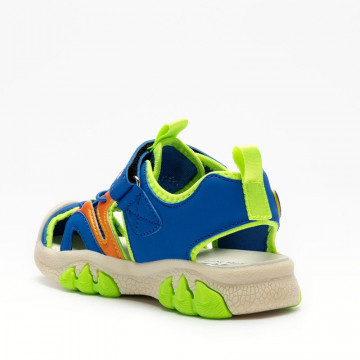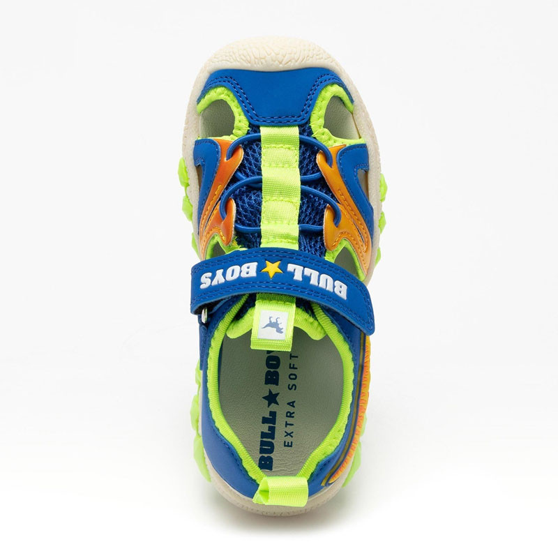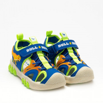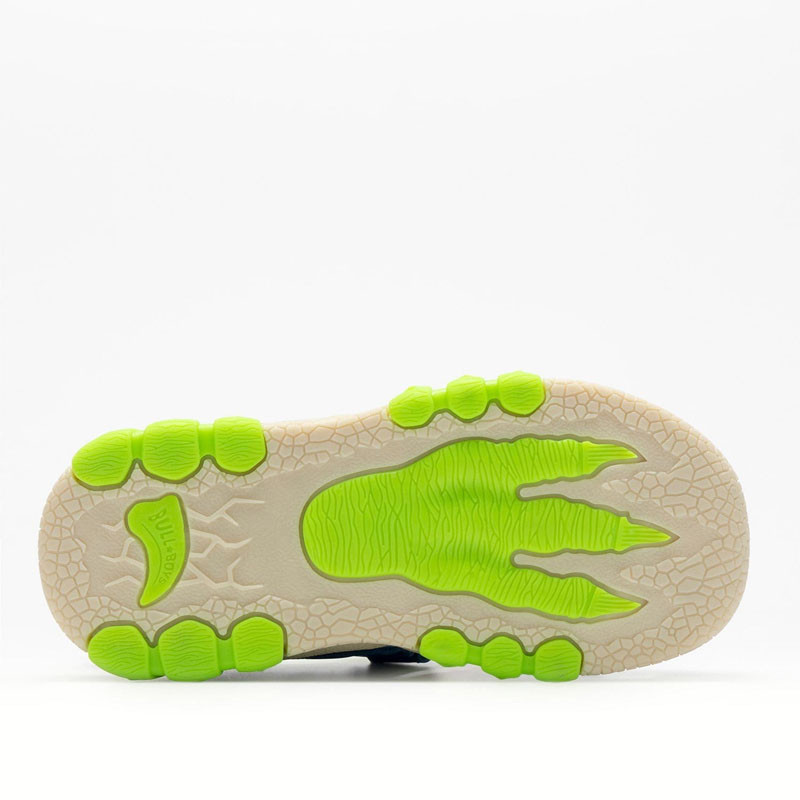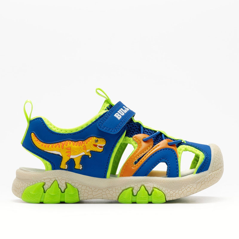 Sandále Bull Boys s dinosaurami, dostupné v mnohých kombináciách farieb a materiálov, sa vyznačujú exkluzívnymi dizajnmi v tvare dinosaura a charakteristickými svetlami, ako aj originálnymi odtlačkami nôh pod podrážkou.