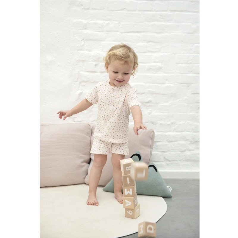 Tieto pyžamá sú roztomilým outfitom pre deti, aby sa pri spánku, maznaní, snívaní a hraní cítili úplne pohodlne. Dvojdielne pyžamo pozostáva z topu s krátkym rukávom s okrúhlym výstrihom a krátkych nohavíc. Vďaka tomu sú ideálne na teplé letné noci.