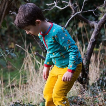 Tričko s dlhými rukávmi od Frugi v červenej farbe s kontrastnými námorníckymi rukávmi a s nádhernou okrúhlou aplikáciou traktora na prednej strane je vyrobená z mäkkej organickej bavlny.