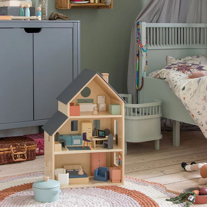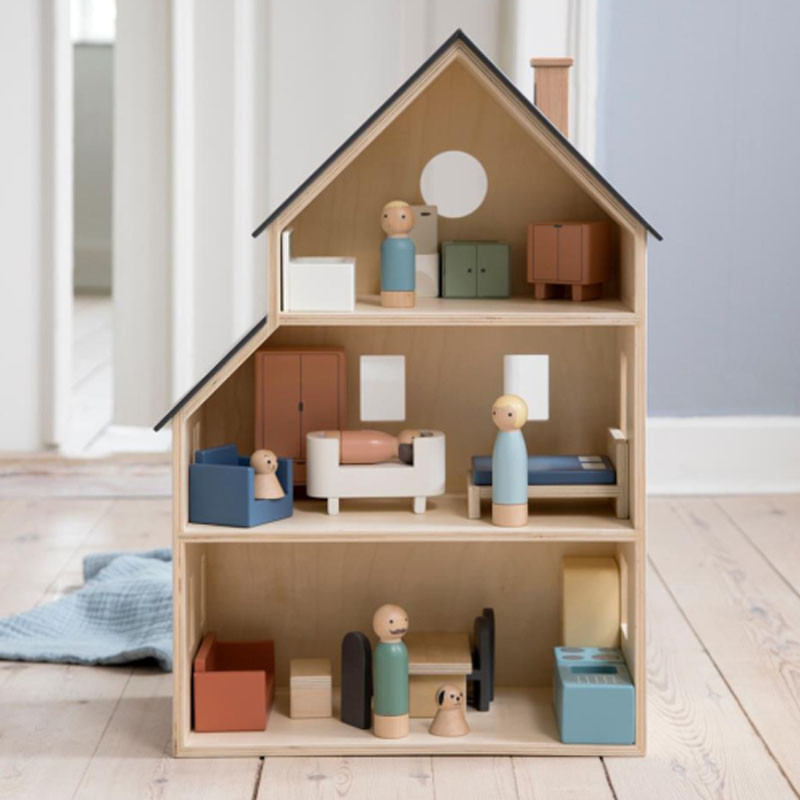 Domček pre bábiky v jednoduchom dizajne a neutrálnom scandi prevedení, ktorý sa hodí do každej detskej, nielen však dievčenskej izbičky.