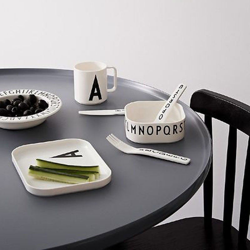 Jedálenská súprava Fine Design Letters v jednofarebnej bielej farbe s písmenom "A" napísaným čiernou typografiou Arne Jacobsena.