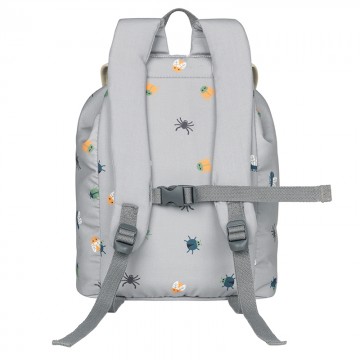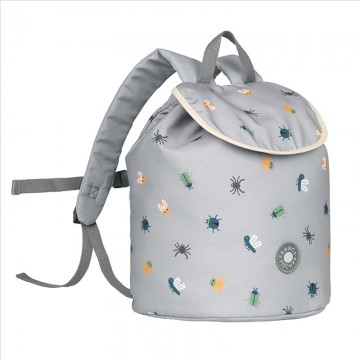 Batoh Ladybug má veľkú priehradku s držiakom na fľašu a menovkou, nastaviteľné polstrované ramenné popruhy, 2 klipsové uzávery a pevnú rukoväť.