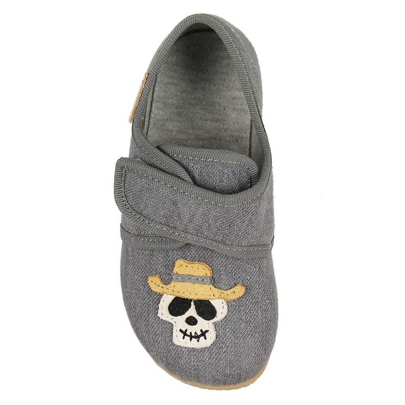 Krásne domáce papučky Living Kitzbühel zo sivého plátna s dvoma rôznymi vzormi aplikácií. Na pravej prednej časti nohy je cool lebka s kovbojským klobúkom, zatiaľ čo na ľavej strane je pekná pirátska vlajka. Aplikácie sú z jemného semišu.