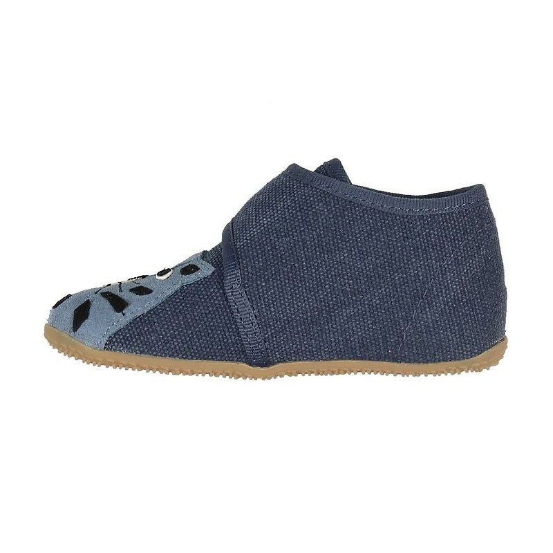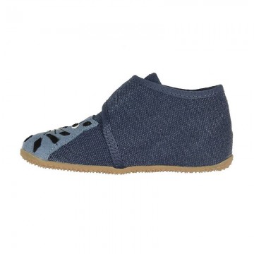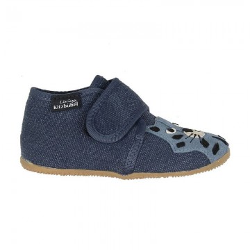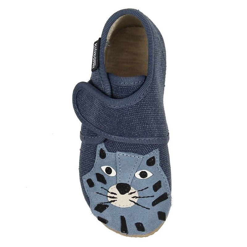 Papuče Lovely Living Kitzbühel z námorníckeho plátna s našitou tigriou hlavou na pravej nohe a tigrím telíčkom na ľavej. Tiger je z modrého semišu a má čierne pruhy.