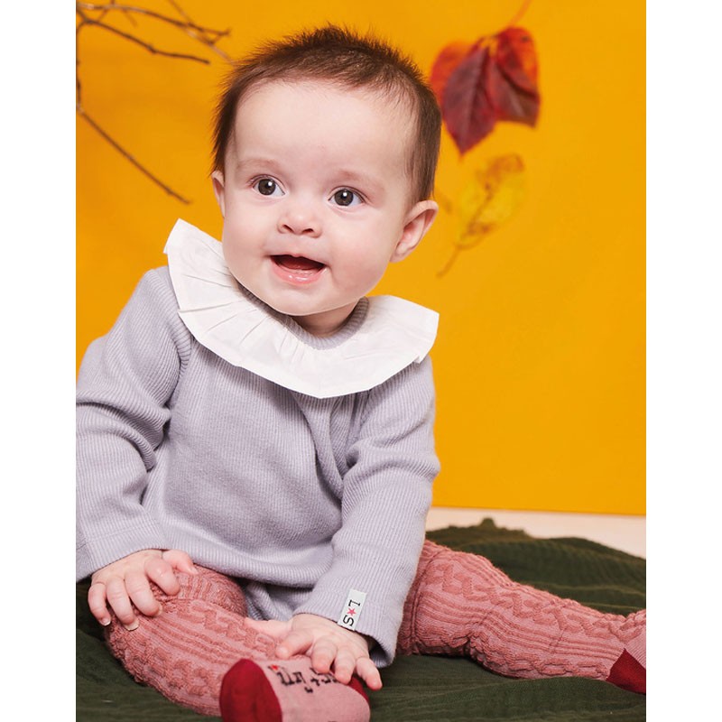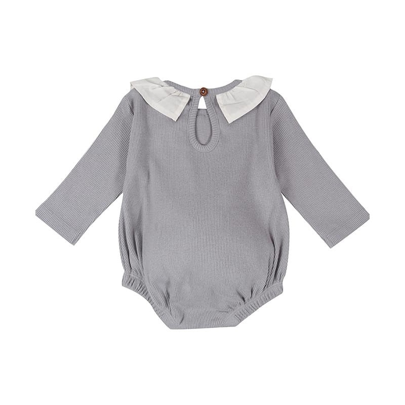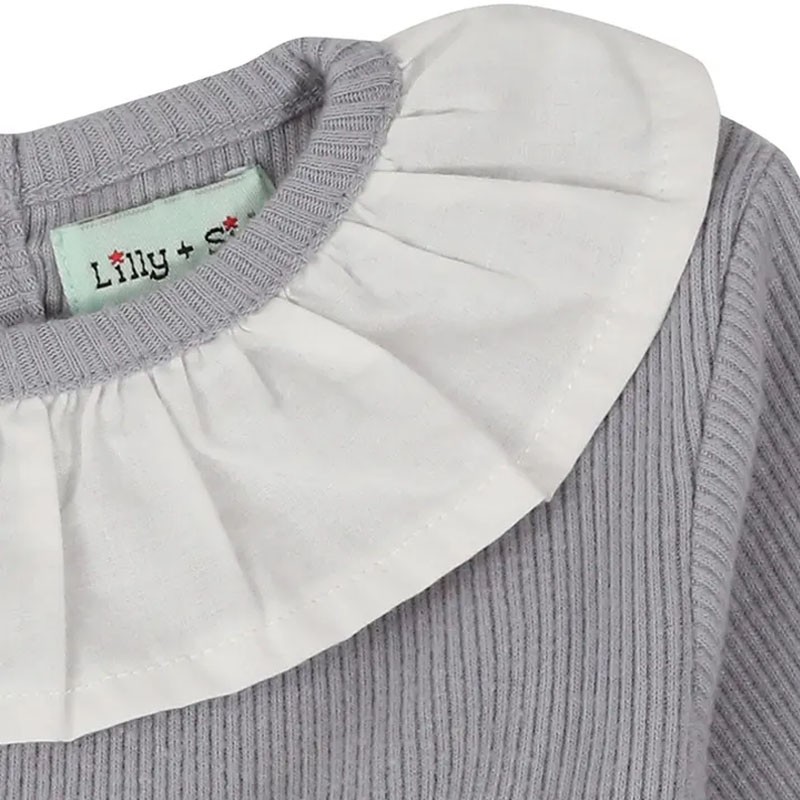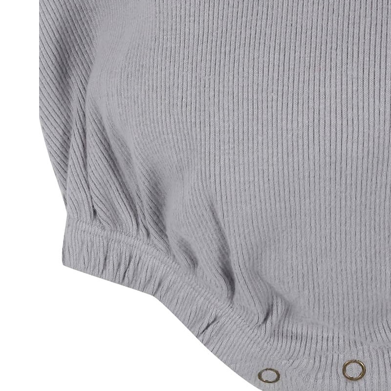 Nádherné rebrované body s volánikmi v trendy šedej farbe, ktoré krásne skombinujete s veselými pančuškami alebo legínami.