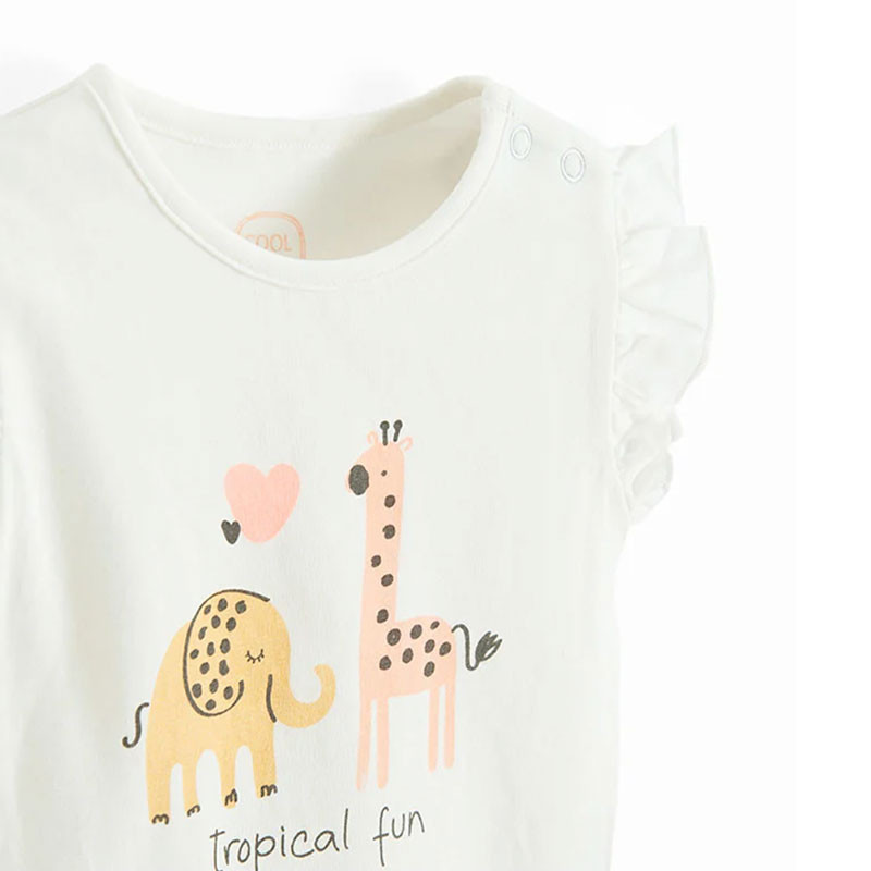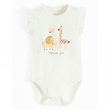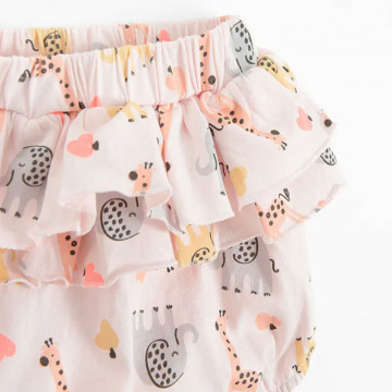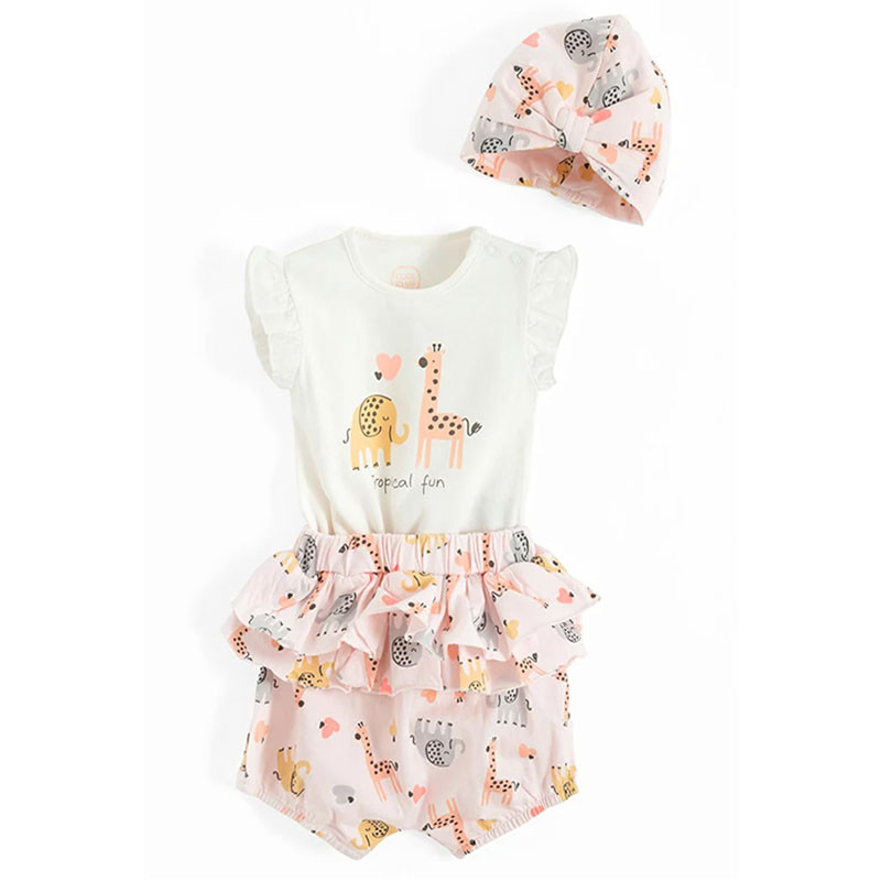 Set obsahuje: 1x body, 1x krátke nohavice s riasením, 1 x letná čiapka/turban