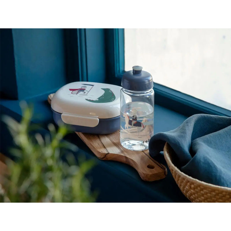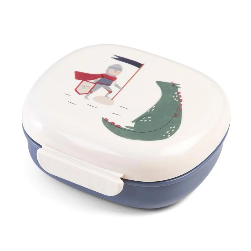 Vďaka elegantnému dizajnu s dvojitým zacvakávacím zatváraním je tento obedár obzvlášť vhodný na nosenie jedál do škôlky, materskej školy alebo školy. Môže sa použiť aj na pikniky. Tento obedár má posuvnú priečku, ktorá uľahčuje oddelenie rôznych potravín, vďaka čomu zostanú čerstvé a príjemné. Spodná časť obedára je celá v tlmenej tmavomodrej farbe, zatiaľ čo vrchnák zdobí krásna potlač s drakom a rytierom v brnení.