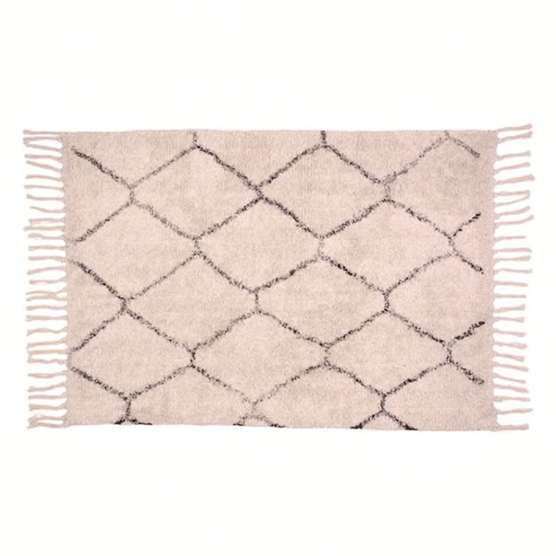 Ručne vyrobený béžový koberček s jemným vzorom a čiernym lemom, ktorý sa hodí do každej miestnosti moderného interiéru.