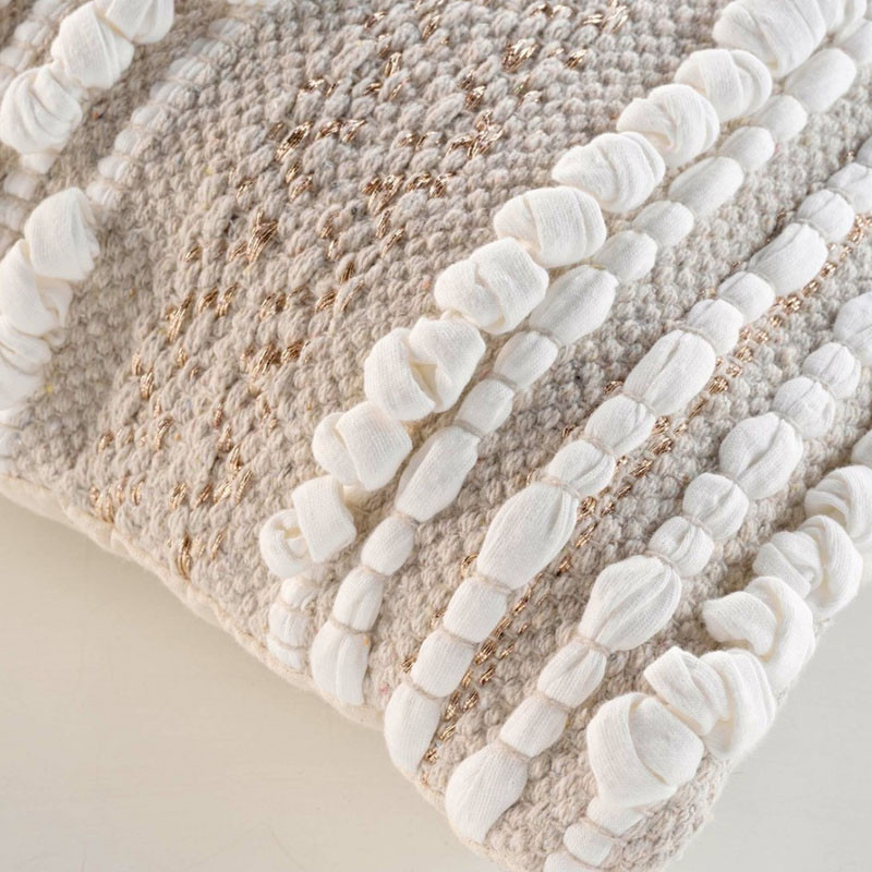 Dekoračný vankúš MIRAGE v boho štýle je modernou dekoráciou pre vaše izby, ktorá vytvorí dokonalú atmosféru v každom interiéri. Vankúš je pretkaný niťou v medenej farbe, ktorá mu dodáva veľmi originálny vzhľad. Keď slnečné lúče preniknú do interiéru a ožiaria ho, nádherne sa v nich rozžiaria.